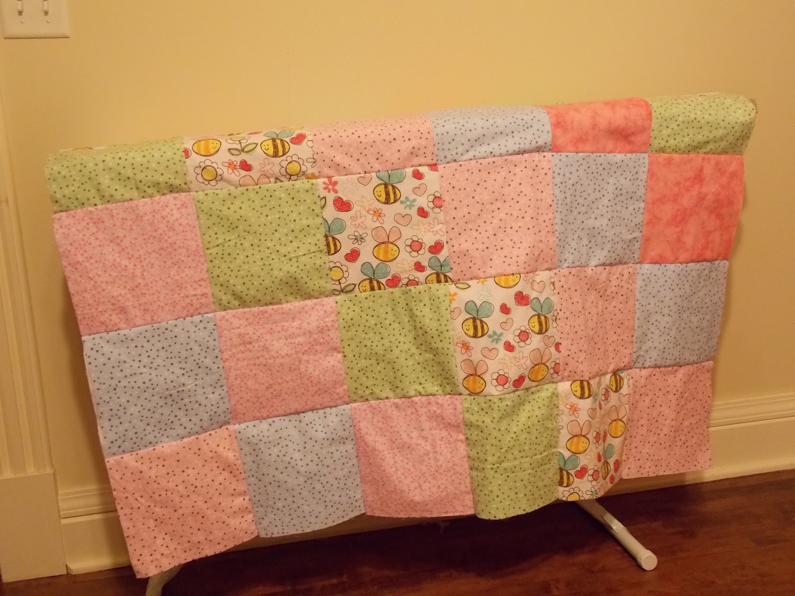 Since then I have been sewing and sewing and sewing. Making serious progress on Megan's baby quilt. I have finished the backing, done the quilting and attached the binding to the back. I just need to get the binding tacked to the from. Here is a picture of it in my fancy new sewing room with my fancy new machine.